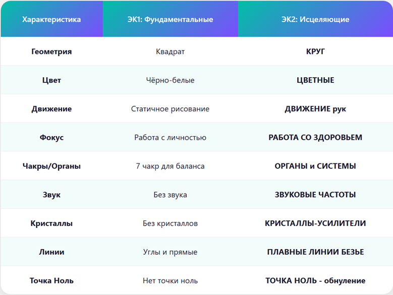 ЭК1 (Фундаментальные) = Квадрат | ЭК2 (Исцеляющие) = Круг